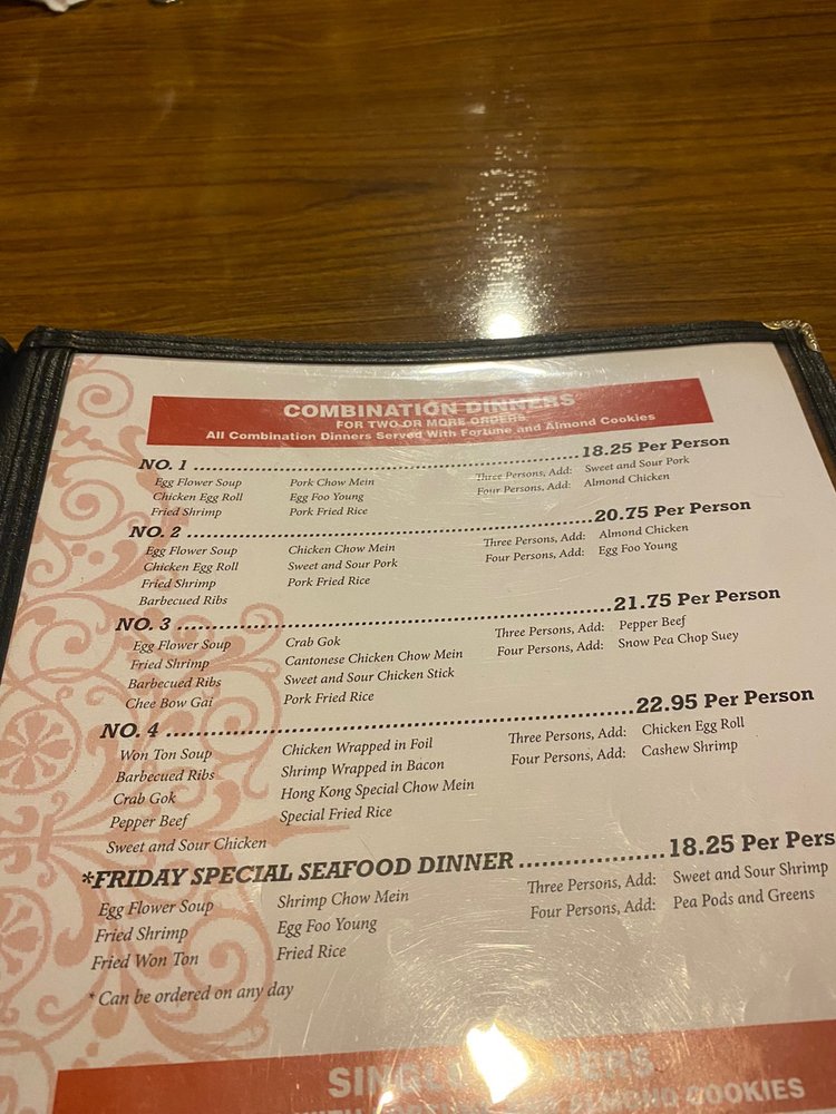 Egg flower soup, chicken egg roll, fried shrimp, pork chow mein, egg foo young, pork fried rice. Served with fortune and almond cookies.