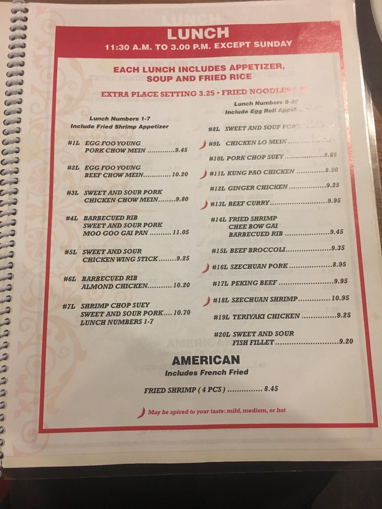 Egg flower soup, pork chow mein, fried shrimp, BBQ rib and pork fried rice. Served with fortune and almond cookies.